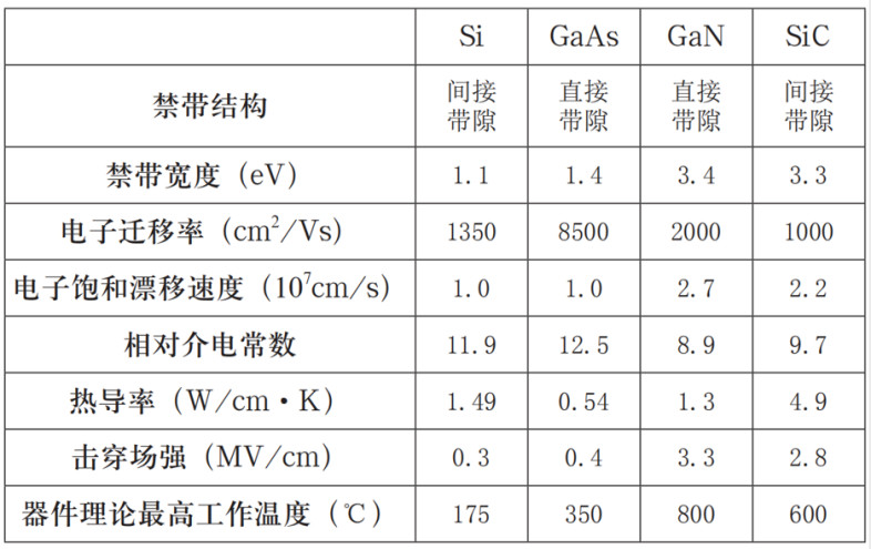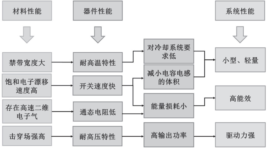 第三代半导体,由于在物理结构上具有能级禁带宽的特点,又称为宽禁带半导体,主要是以氮化镓和碳化硅为代表,其在半导体性能特征上与第一代的硅、第二代的砷化镓有所区别,使得其能够具备高禁带宽度、高热导率、高击穿场强、高电子饱和漂移速率等优势,从而能够开发出更适应高温、高功率、高压、高频以及抗辐射等恶劣条件的小型化功率半导体器件,可有效突破传统硅基功率半导体器件及其材料的物理极限。
