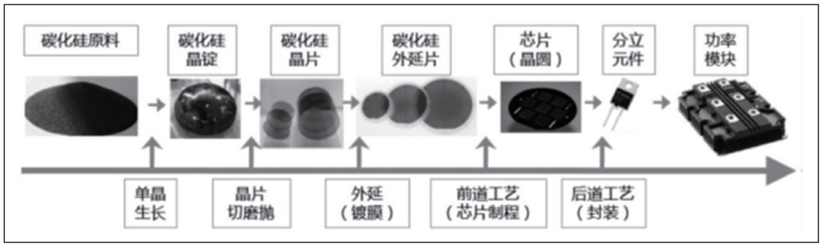 碳化硅功率器件整个生产过程大致如下图所示,主要会分为碳化硅单晶生产、外延层生产、器件制造三大步骤,分别对应产业链的衬底、外延、器件和模组三大环节。