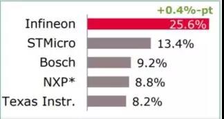 从汽车用功率半导体厂商排名来看,来自strategy analytics的数据显示,英飞凌以25.6%的市占率排第一,意法半导体13.4%排第二,博世9.2%排第三,恩智浦8.8%排第四,紧随其后的是德州仪器,市占率为8.2%。