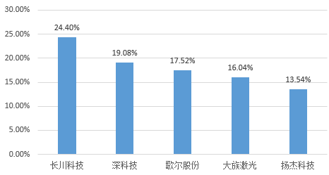 中国大陆半导体发展指数有57家公司上涨,8家公司下跌。其中涨幅前五名的公司分别是长川科技(+24.40%)、深科技(+19.08%)、歌尔股份(+17.52%)、大族激光(+16.04%)、扬杰科技(+13.54%);跌幅排名为强力新材(-6.17%%)、飞凯材料(-5.18%)、上海新阳(-3.01%)。