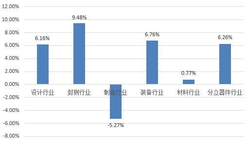 分领域来看,上周中国大陆半导体设计、封测、装备、材料和分立器件行业均实现上涨,制造领域有所下降。其中,设计行业指数上涨了6.16%,封测行业指数上涨了9.48%,制造行业指数下降了5.27%,装备行业指数上涨了6.76%,材料行业指数上涨了0.77%,分立器件行业指数上涨了6.26%。