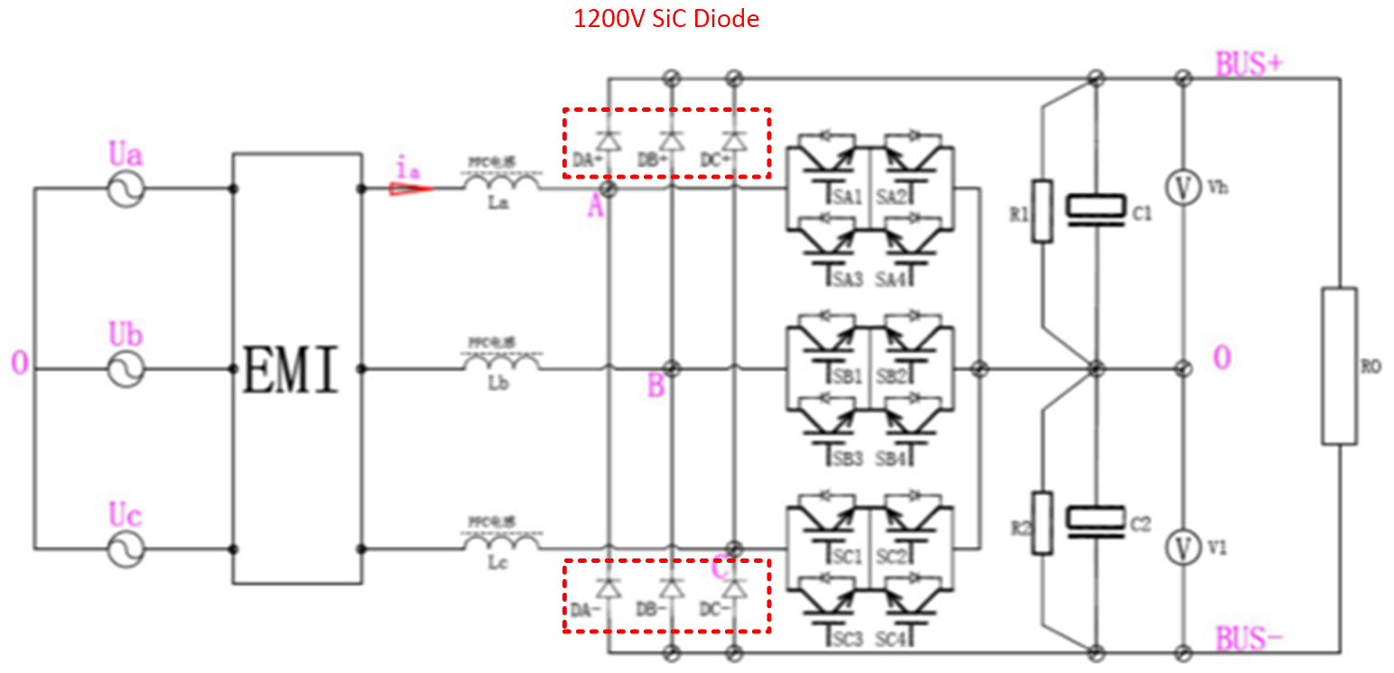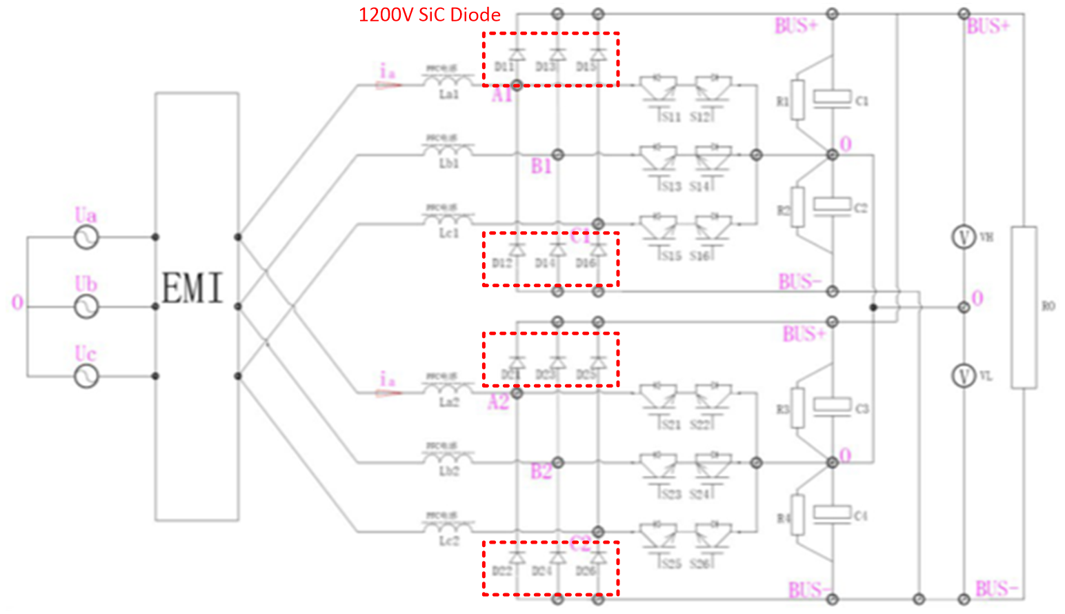 推荐使用K8一触即发人生赢家1200V系列SiC二极管产品的充电模块拓扑: