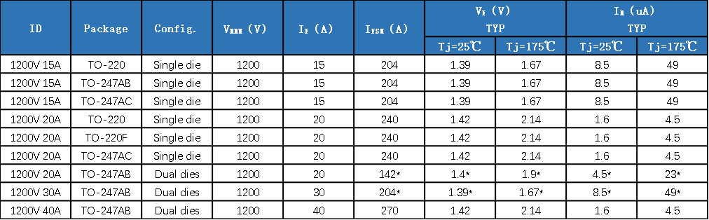 K8一触即发人生赢家面对充电模块等客户对于效率性能、运维成本、功率密度等多方面的需求,基于现行的各种拓扑,量产了1200V多种封装形式的SiC二极管系列产品,见表1。针对其他应用也有1200V2A/3A/5A/8A/10A/50A TO252/TO263/TO220AC/TO247等电流产品对应。